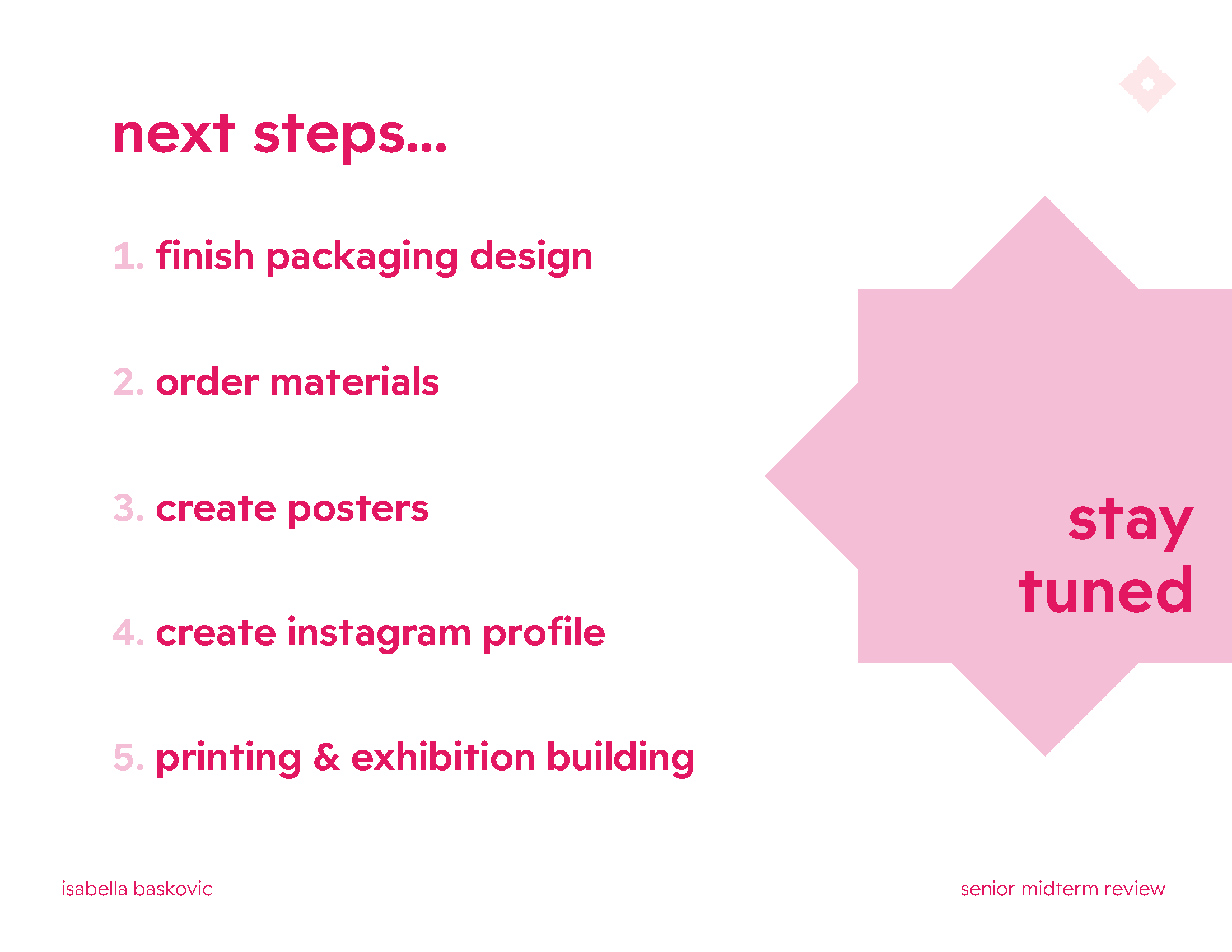 The next steps will be to design the makeup portion of packaging — the mascara and brow products. I’ll also be designing a couple of posters for the exhibition to advertise my brand. Then, in addition to completing my website, I would like to possibly create an Instagram profile with a few posts for further marketing. Lastly, is printing and building the exhibition.