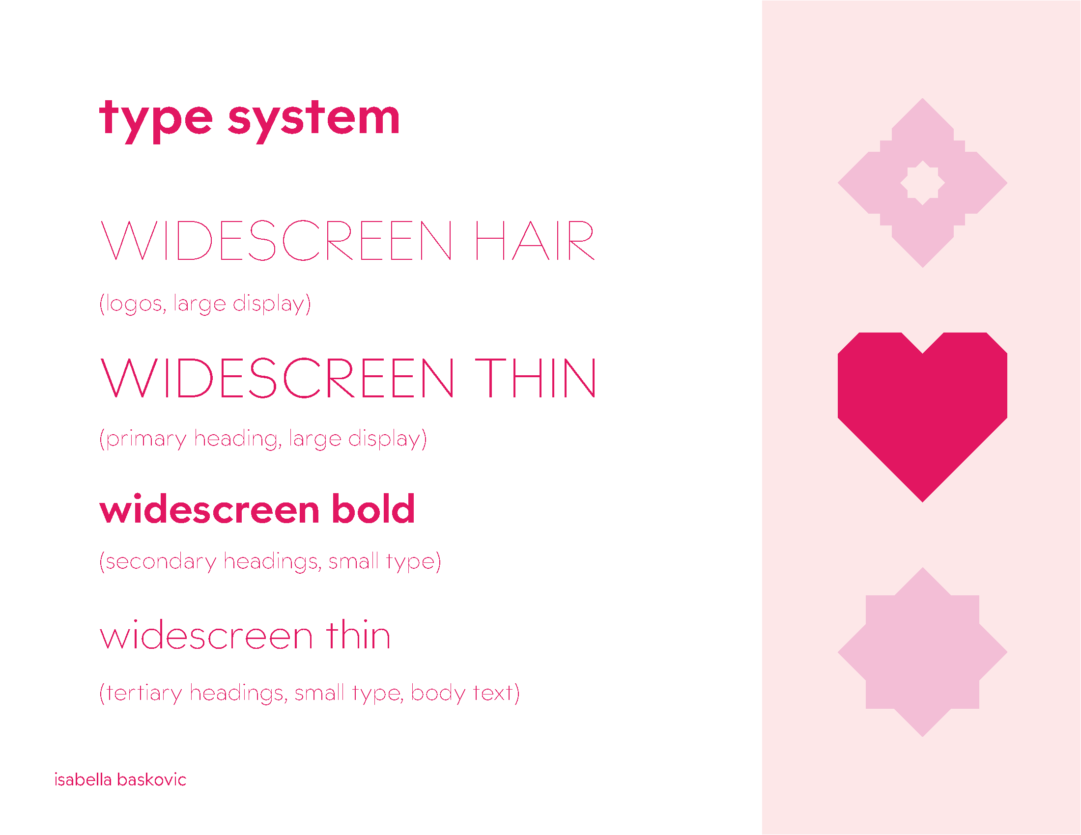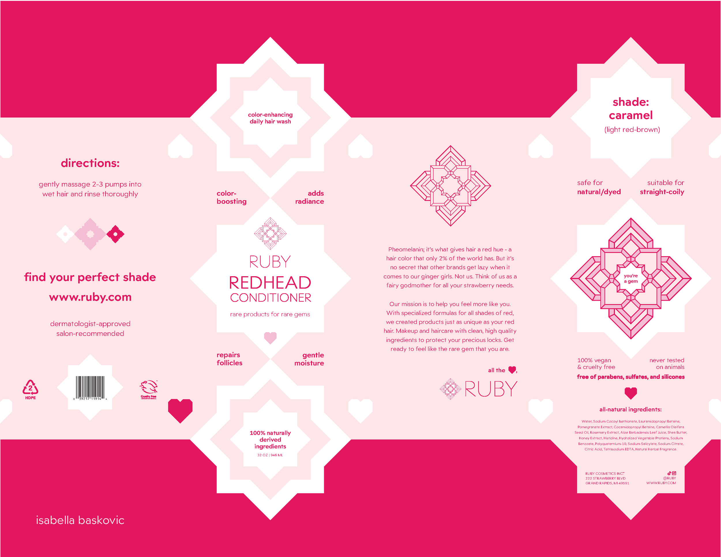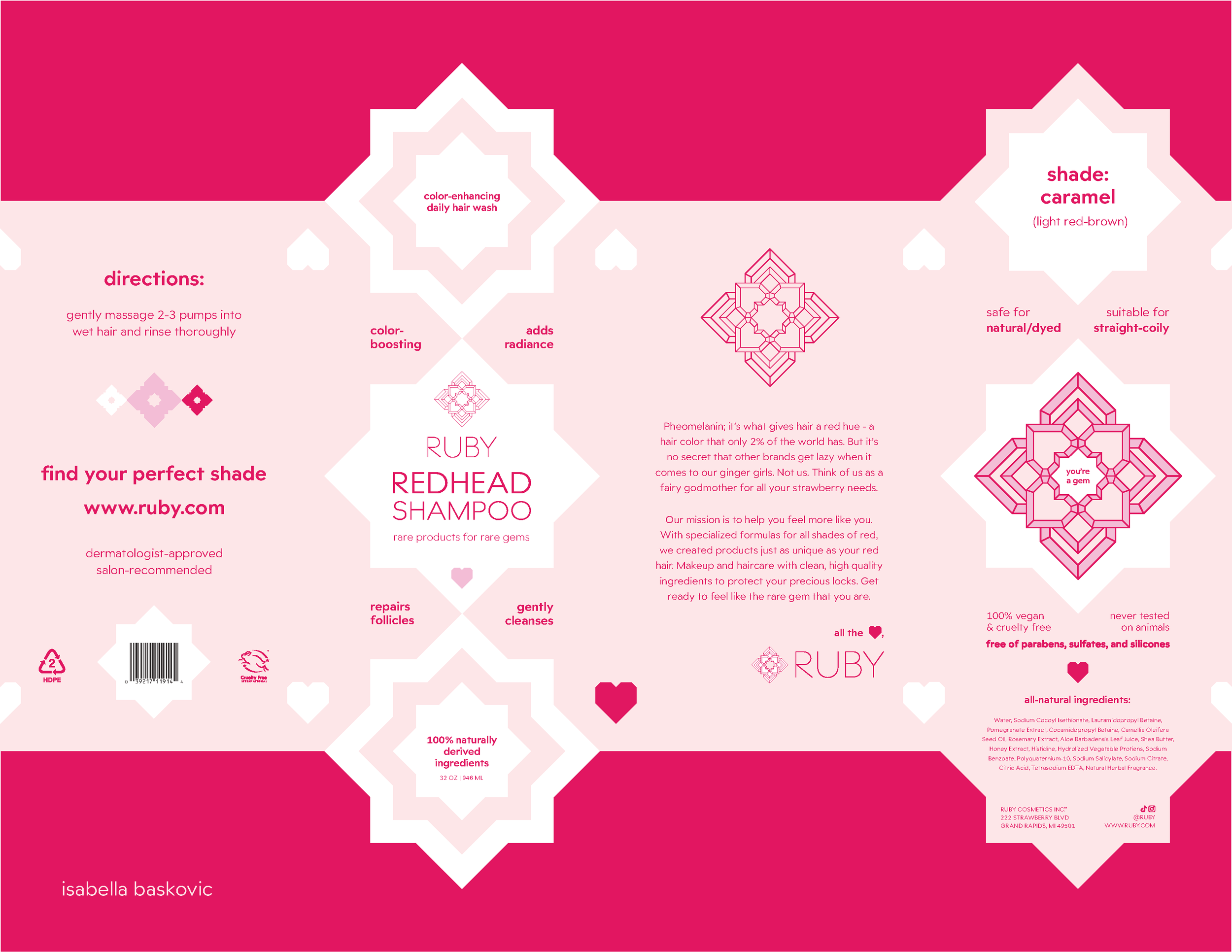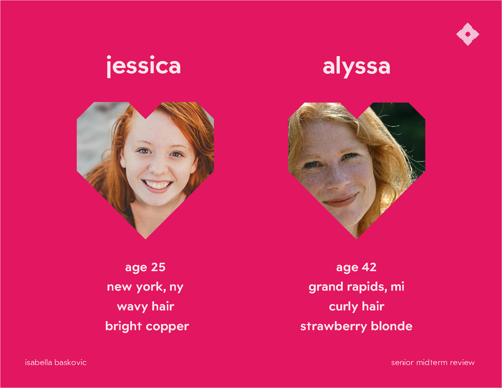 I went with a quite feminine color palette to cater to my demographic of redhead women. I decided against a true red color to avoid being too literal. I also had originally planned on adding orange, but ultimately decided against it due to the negative feelings that redheads often have about being classified as orange.