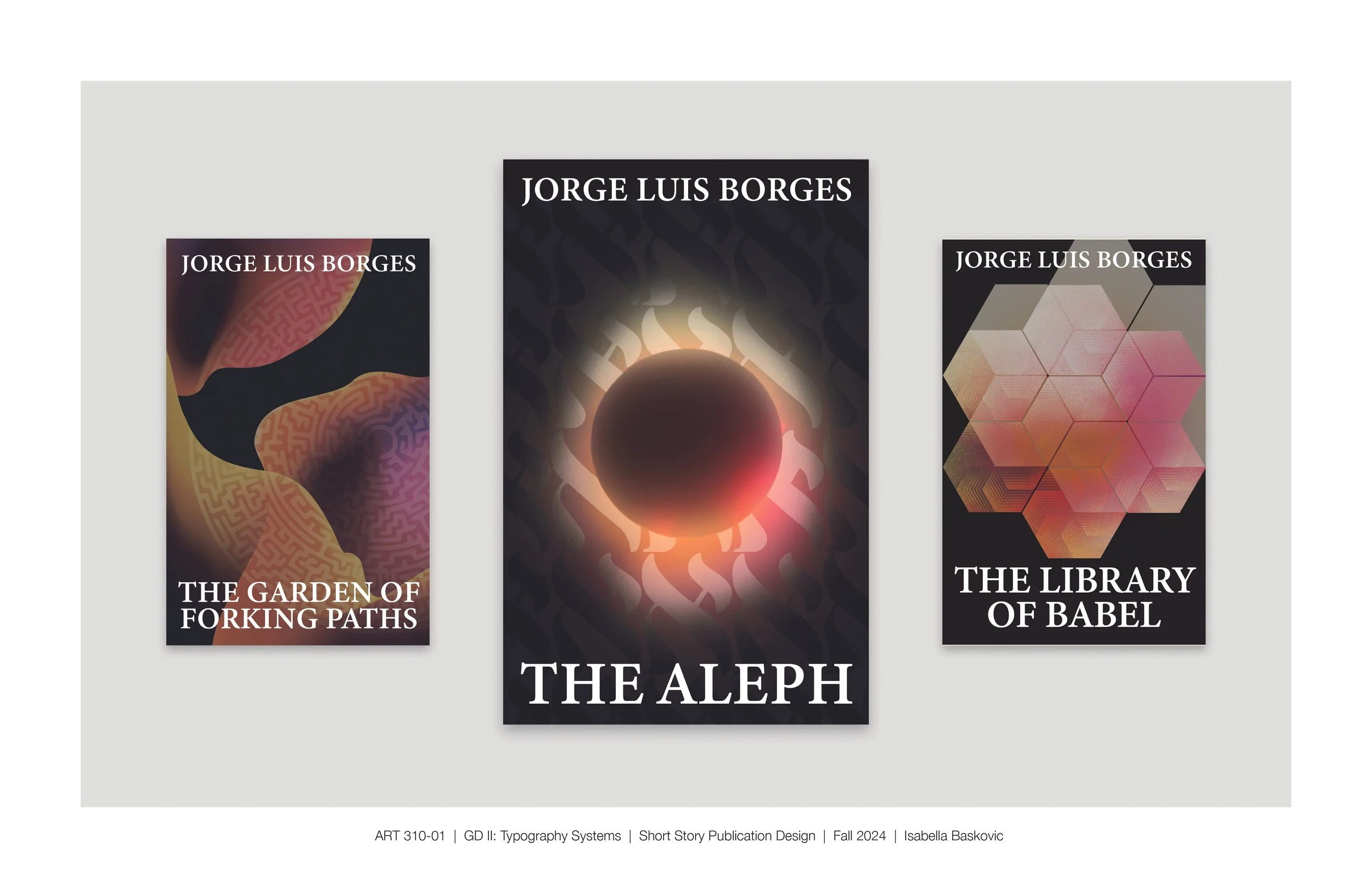 A set of book covers i created for my sophomore year typography class. features 3 short stories written by Jorge Luis Borges. These books, while not in a series, share similar themes of philosophy and sci-fi. Their covers are meant to reflect the individual stories for each book, and also to create a new and cohesive visual identity for the author.